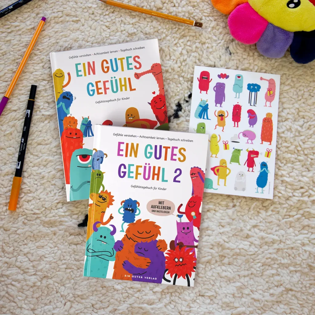 Unsere Gefühlstagebücher Ein gutes Gefühl und Ein gutes Gefühl 2 begleiten Kinder durch ihren ganz persönlichen Gefühlsdschungel. Die Reflexions- und Bastelseiten laden zum Schreiben, Werkeln und zum Austausch ein und geben dem, was im Kopf und im Bauch passiert, einen festen Platz. Für viele Familien und Fachkräfte sind sie mittlerweile zu einem festen Begleiter im Alltag geworden.