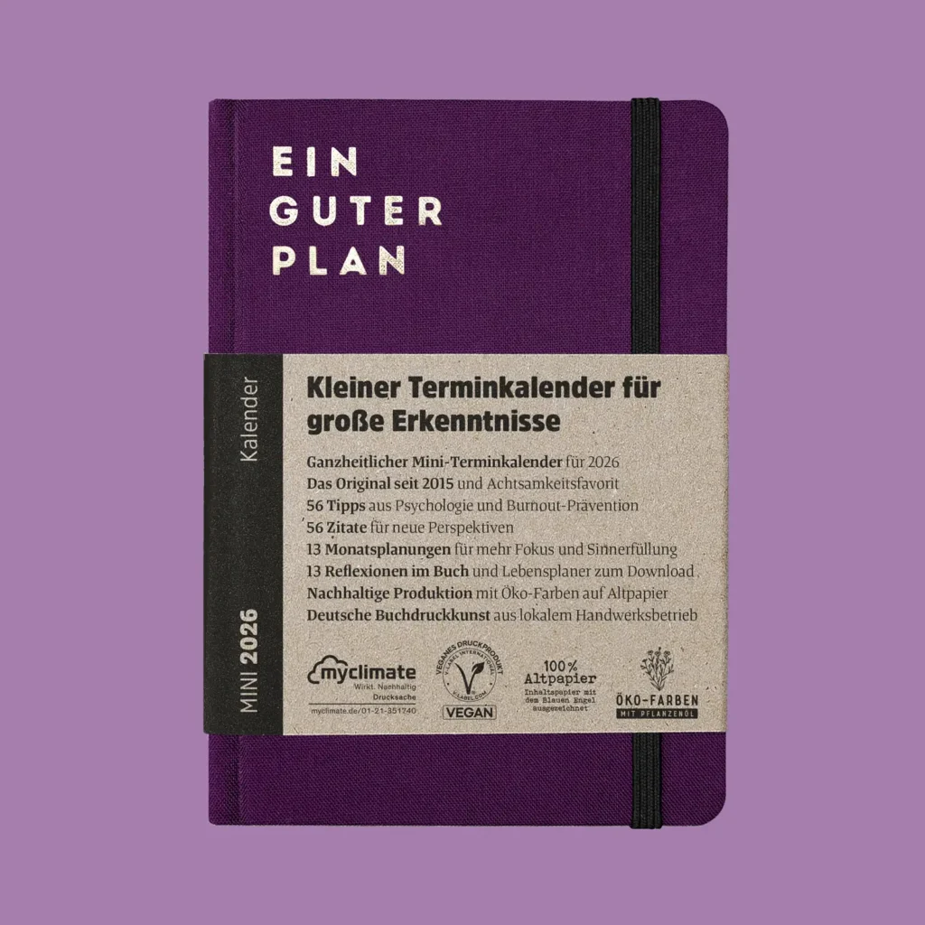 Ein guter Plan Mini 2026 ist ein ganzheitlicher Terminkalender für mehr Achtsamkeit und Selbstliebe im handlichen Format DIN-A6. Es ist mit Abstand unser kleinster Kalender und wurde auf Wunsch unserer Community entwickelt. Mit ihm kannst du dich auch unterwegs in Achtsamkeit und Entschleunigung üben, ohne deine Termine zu vernachlässigen.