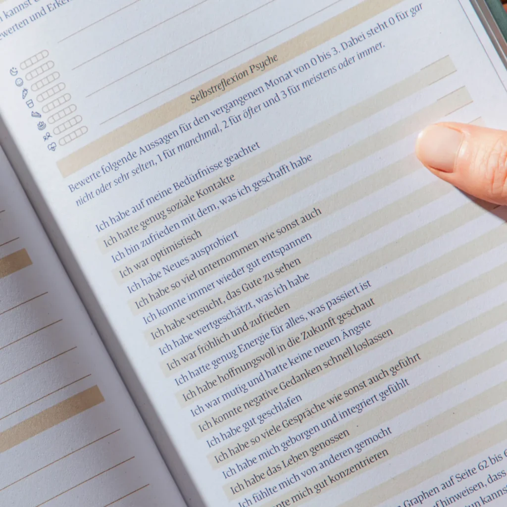 Mach zu Beginn eine große Bestandsaufnahme. 50 Seiten Lebensplaner leiten zu ehrlicher Selbstreflexion an. Was macht dich glücklich? Was sind deine Bedürfnisse? Wie gefährdet bist du für Burnout? Die Fragen gehen ans Eingemachte, aber Ein guter Plan ist auch kein seichter Wohlfühlplaner, der dir ständig rät, nur das Positive zu sehen.